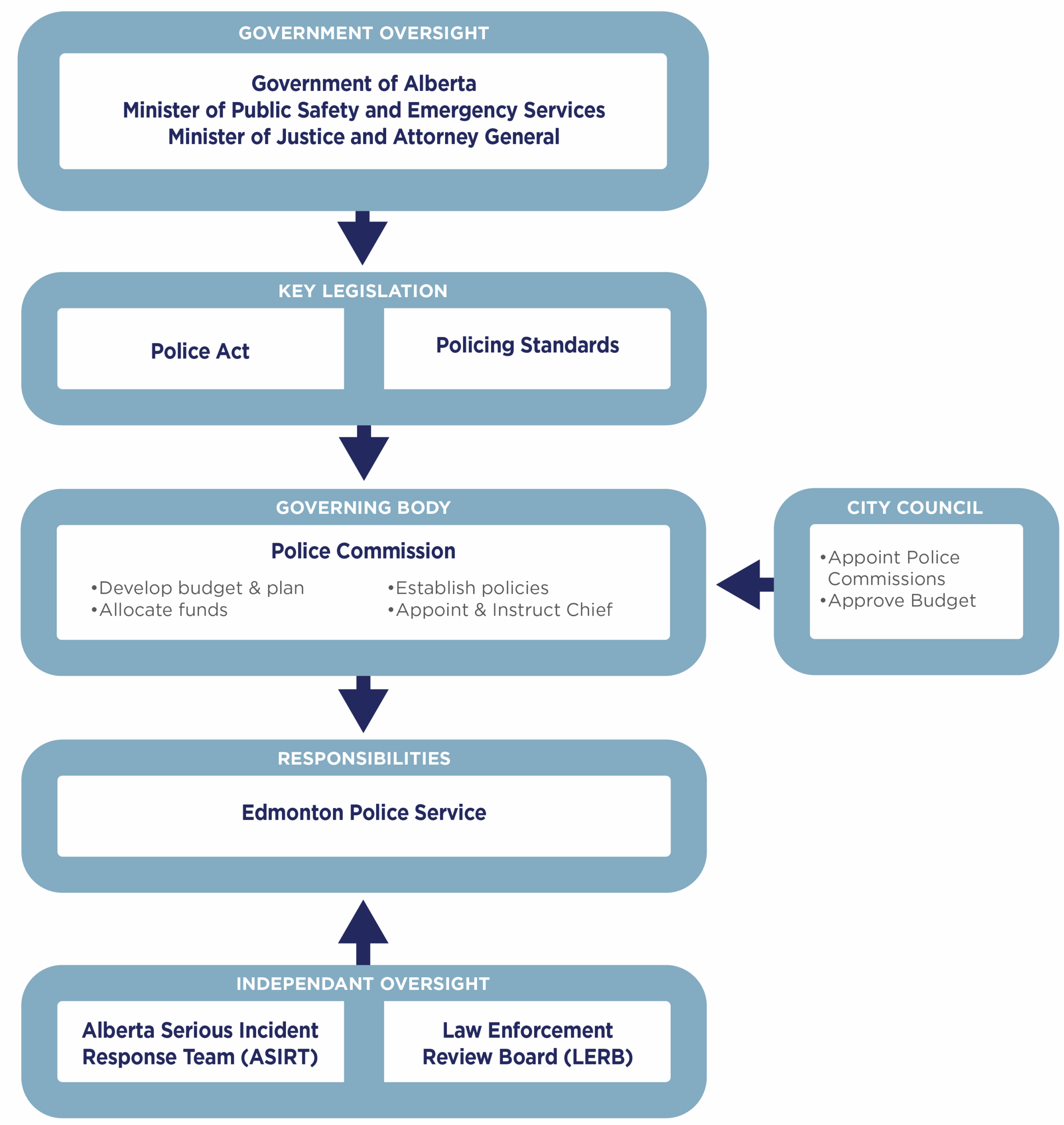 In democracies, police must remain independent while being accountable to the public. To balance these priorities, Alberta’s Police Act requires that City Council appoint an independent police commission to oversee the police, rather than having them report directly to City Council. The Government of Alberta may also appoint a Commissioner as deemed necessary. While City Council approves the overall police budget, it is the Edmonton Police Commission that determines how the budget is allocated. The Commission also oversees the police chief, establishes police policies, and monitors the process for addressing complaints about police conduct. The Alberta Serious Incident Response Team (ASIRT) investigates police incidents and complaints involving serious injury, death or other significant allegations of misconduct. The Alberta Law Enforcement Review Board (LERB) hears appeals related to complaints of officer misconduct.