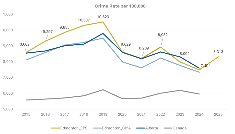 This measure provides an overview of the current state of property crime in Edmonton. It also reflects the progress made by law enforcement and support efforts in reducing or maintaining property crime at a low and stable level.