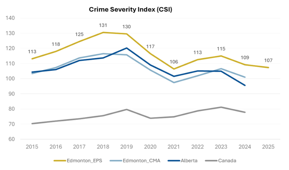 • In 2025, Edmonton’s CSI showed a slight decline. While there was a small increase in violent crime, this was offset by decreases in less severe non-violent offences, resulting in an overall downward trend in the index.
